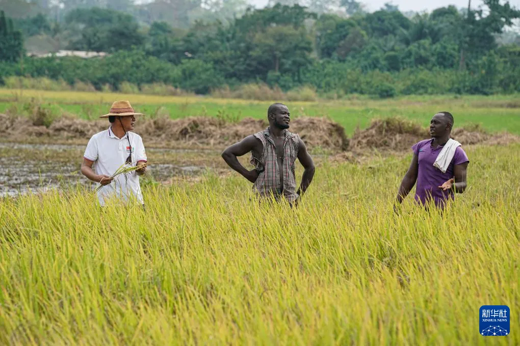On January 8, Mr. Guo, leader of the China-aided agricultural technology cooperation group, communicated with farmers in the Gegedou Reclamation District of Divo Province, Côte d'Ivoire.